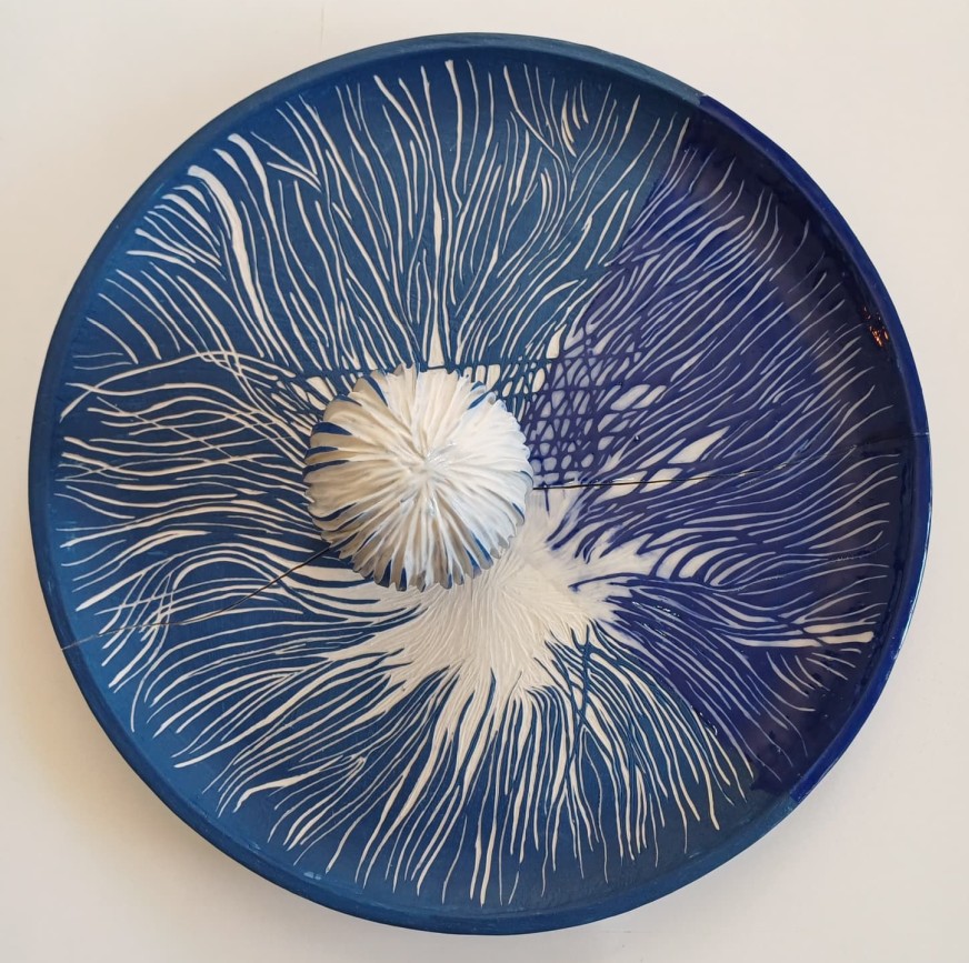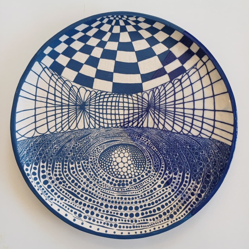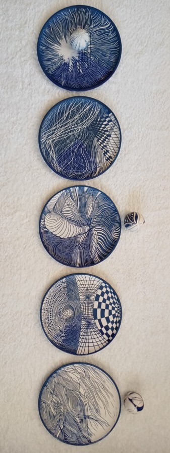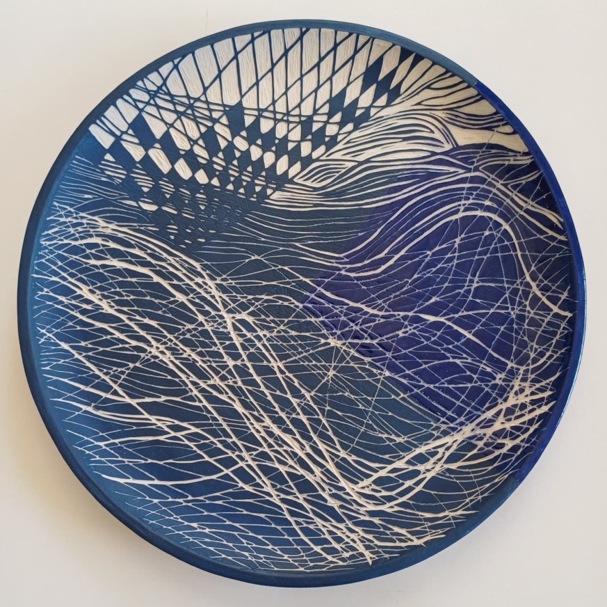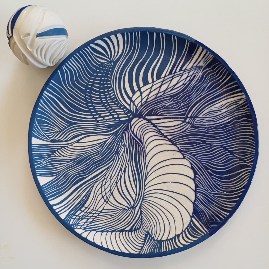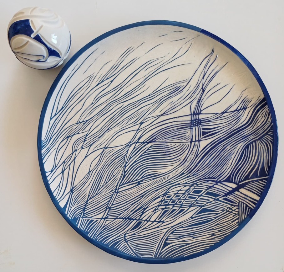 Seramik stonewear, astar kazıma ve derin oyma tekniği, tabak 34,5×2,5 cm + küre 8,5 Ø cm